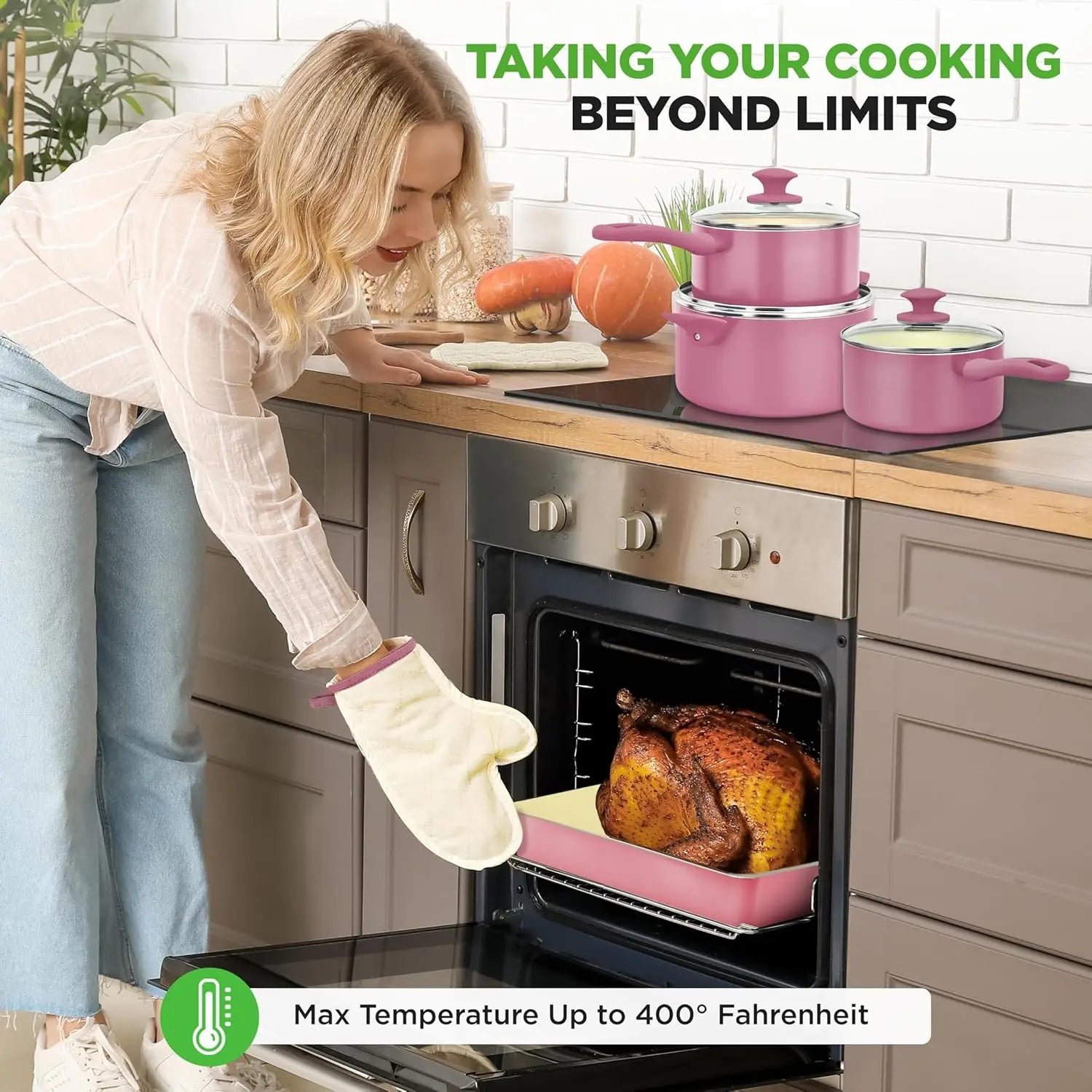 The blush pink finish adds a stylish touch to any kitchen, combining fashion with function. This durable, all-in-one kit is designed to handle everyday cooking and more ambitious recipes, whether you’re searing, simmering, baking, or roasting.