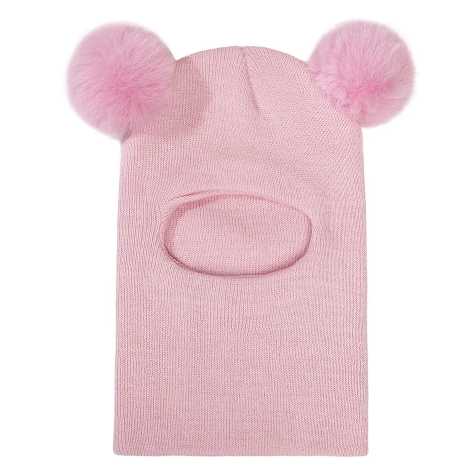Kids Double Ball Ear Protection Knit Balaclava Hat