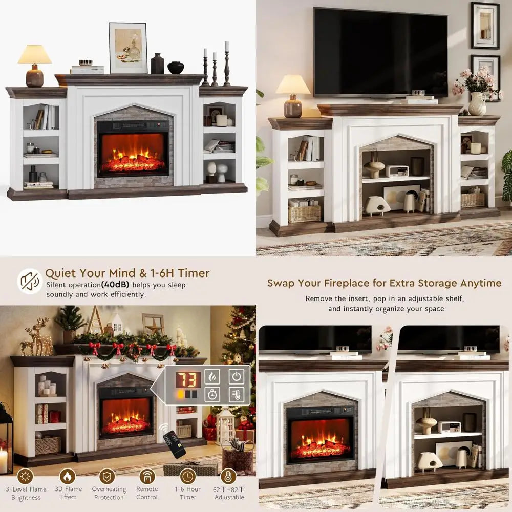 - Six adjustable shelves provide flexible storage; the fireplace insert can be removed to add an extra shelf for even more space.