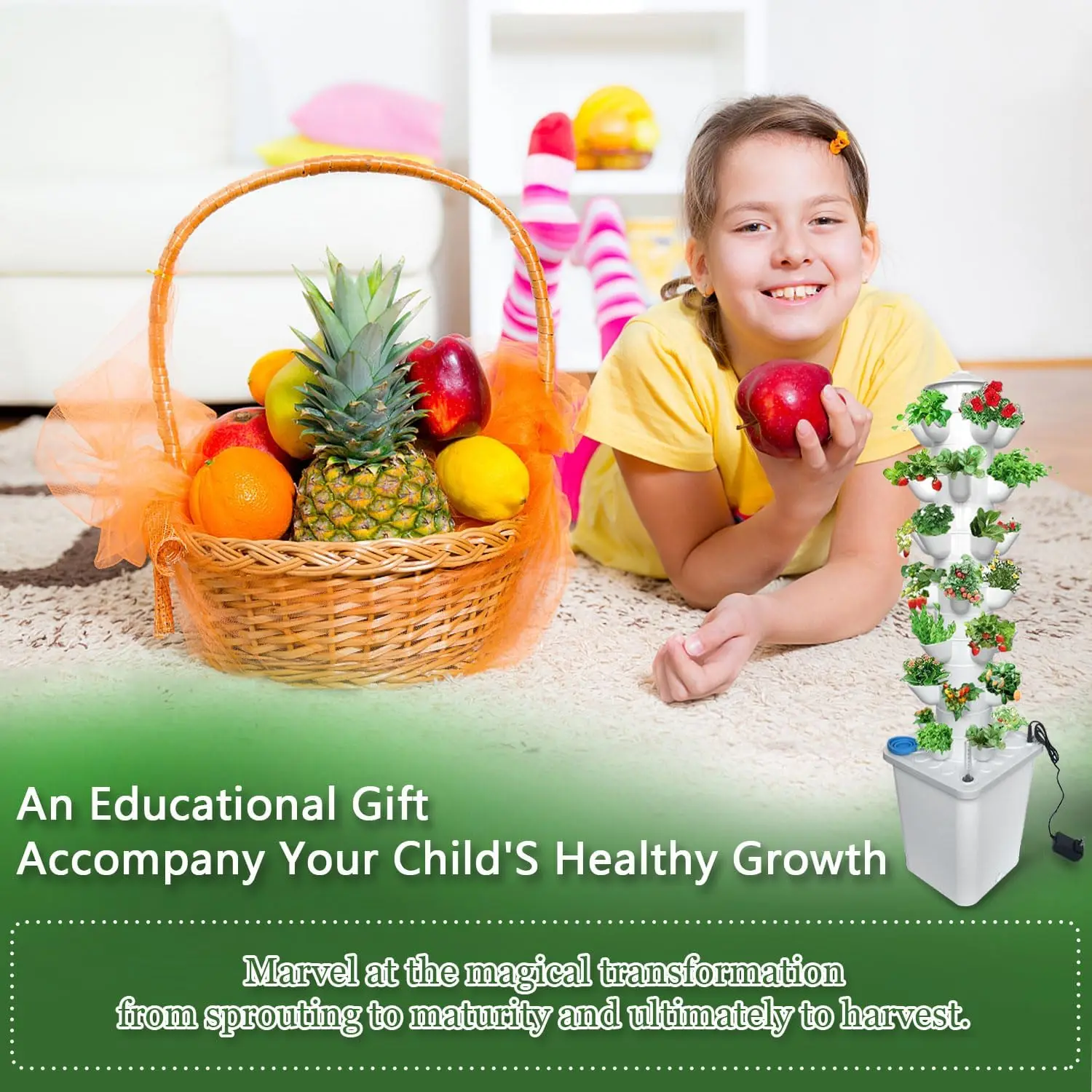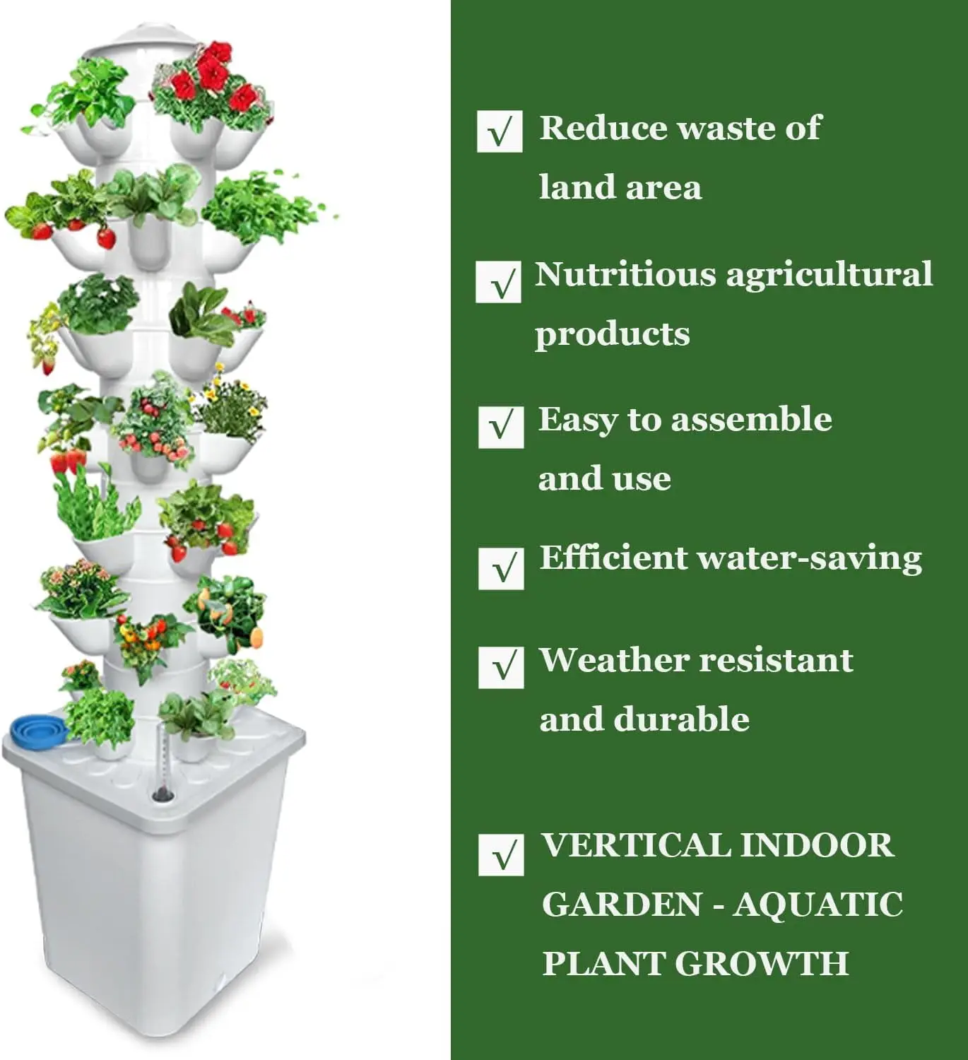 This hydroponics tower system is designed for both indoor and outdoor gardening without the need for soil. It features a user-friendly design and straightforward instructions, making it easy for anyone to grow fresh, high-quality vegetables at home. The compact and portable size of this hydroponic garden tower is ideal for any space, and its vertical design is efficient and clean, allowing you to cultivate a variety of vegetables, fruits, and flowers. The tower operates on hydroponics, which is more water-efficient and productive than traditional soil planting. The top-down automatic water circulation and timed watering system ensure that plants receive consistent nourishment and grow more rapidly. The system includes a timer, which can be programmed to turn the tower on and off at specific intervals, saving both time and energy. This vertical hydroponic growth kit, also known as indoor sky planting, enables you to grow up to 20 different types of produce simultaneously, such as tomatoes, lettuce, eggplants, strawberries, mint, peppers, and cucumbers. The kit comes with a variety of accessories, including a 7-story-5-hole tower with 35 plant sites, a water tank, a quiet water pump, a foldable funnel, 64 growing sponges, a water level indicator, and a power adapter. Please note that seeds and plant food are not included with the kit.